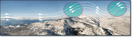 I f conditions are favourable, another area of lift can be created on the leeward side of a hill or mountain, this is called wave lift . As the wind travels over the hill or mountain and comes back down the other side, it encounters the stable air mass on the backside (lee side) of the mountain. When it hits this stable air it is deflected away or rebound in an upward direction. This rebounded air will continue to rise, then it forms a crest and returns back towards the grounds, where it hit the stable air again and is deflected once again. This action forms a standing wave (waves that remain in the same spot) and may continue for many cycles, losing intensity as it gets further away from the mountain.
